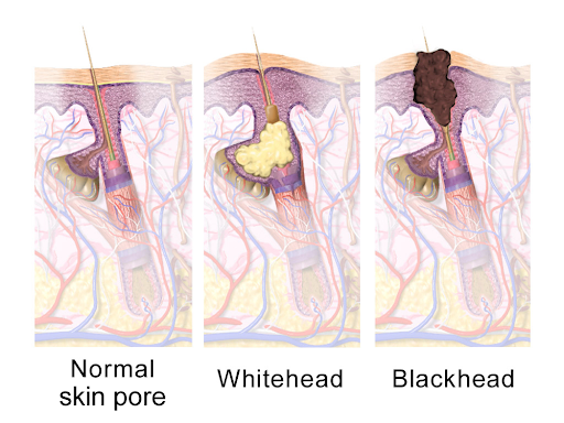 Blackheads, also called open comedones, form when the pore around the follicle remains open. The pimple appears black because it is exposed to the air and elements.