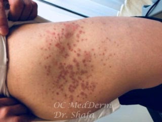 The disease may attack the skin all over or be limited to one area, such as the rash on the buttock shown in the picture of our patient.